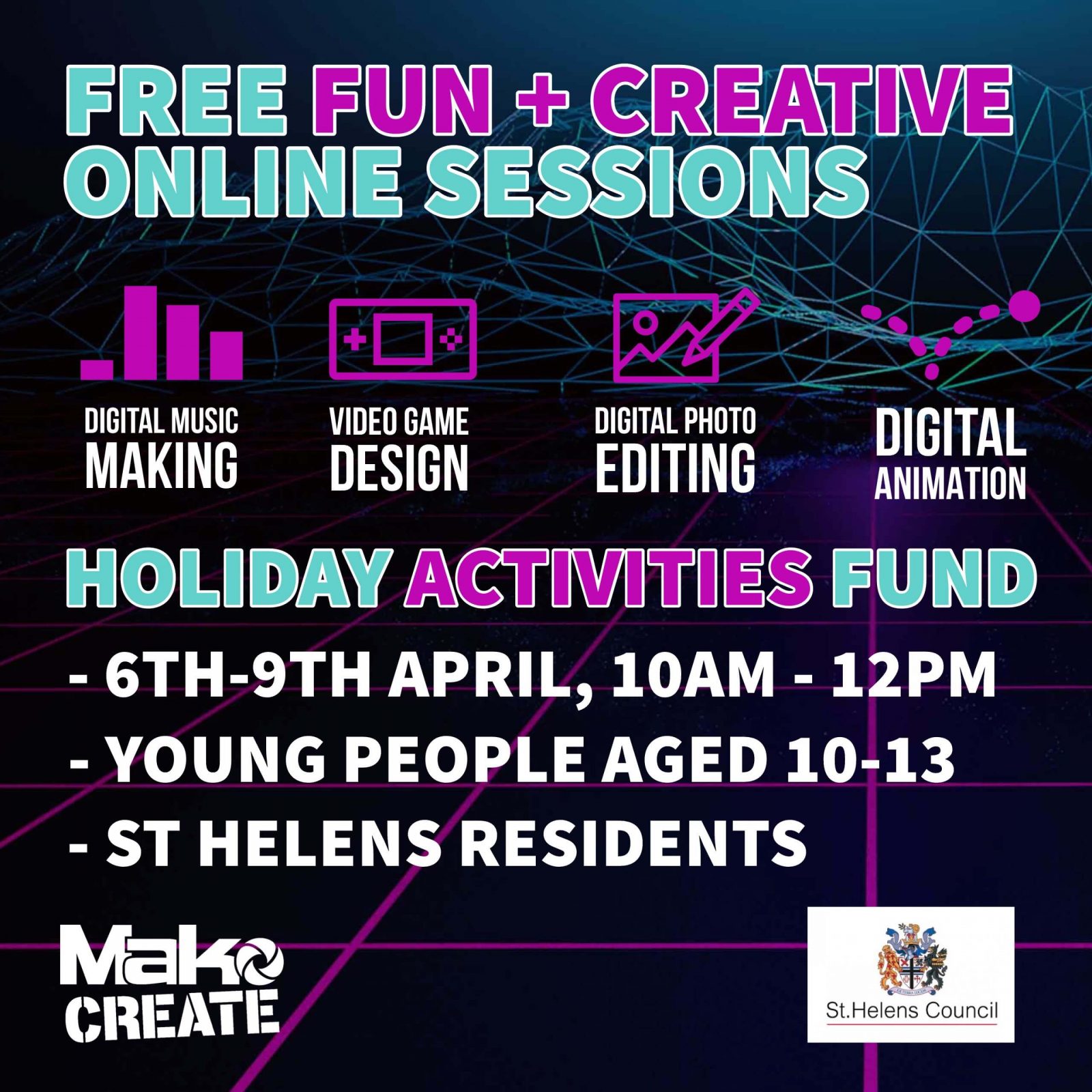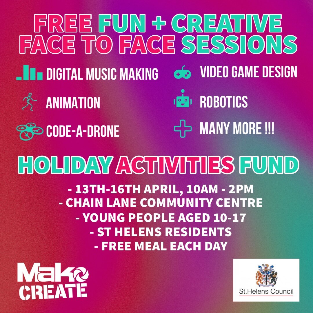 We are thrilled to be working in partnership with MakoDigital Arts CIC this Easter holidays to deliver FREE creative activities to young people from St Helens and Halton. These activities are part of the Holiday Activity Fund. This funding has enabled us to deliver a blended approach to activities with both online and face to face sessions. As well as delivering creative sessions we will also be working with partner organisations to provide food for the young people who take part in the face to face sessions.